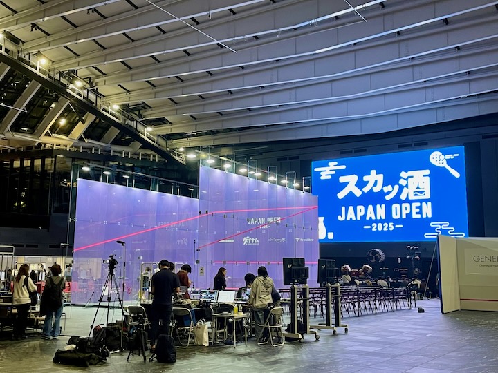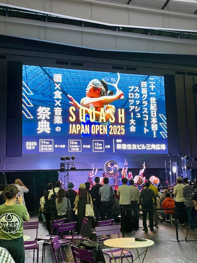 2002年当時、大きな大会が開催された「ルネサンス幕張(コート数4面?、2011年?に閉鎖)」や「コータコート(コート数9面、2006年に閉鎖)」などは既になく、国際大会を開催するインフラは整っているとは言えない。例えば、2025年10月に開催されたUSオープンの会場は22面のコートを有する。*フィラデルフィアにあるその施設は常設の観客席付き全面グラスコートが2面、ダブルスコートが2面もある。今回のJAPAN OPENは1回戦、2回戦は「Greetings Squash Yokohama(と言っても最寄りは北新横浜駅)」にある4面のコートで開催され、準々決勝、準決勝、決勝は西新宿の「新宿住友ビル三角広場」に設営された4面グラスコートで行われた。いずれの会場も観客席数は多いとは言えず、ましてや公式発表されてはいないが、有料入場者数は限定的だ。